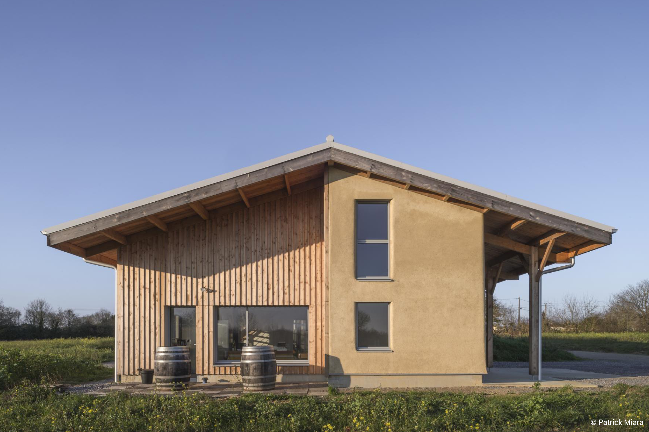 Le projet exploite la déclivité du terrain suivant une logique bioclimatique. L’espace de vinification situé sur l’extrémité nord du bâtiment est partiellement enterré afin de bénéficier de l’inertie naturelle du sol. Le projet privilégie l’emploi de matériaux biosourcés : l’isolation en paille hachée (pour la première fois en Pays de la Loire) dans les murs bois épais, la ouate de cellulose en toiture et les compléments extérieurs en fibre de bois offrent un déphasage important utile à l’élevage vigneron. Un mur en terre crue issue des fouilles, complète le dispositif.
